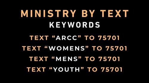 Church family, if you want to stay up to date with what's going on here at ARCC, text any of these words to the number 75701. We would love you to get specific updates about these areas of ministry, so please take advantage of another way to stay in the loop!